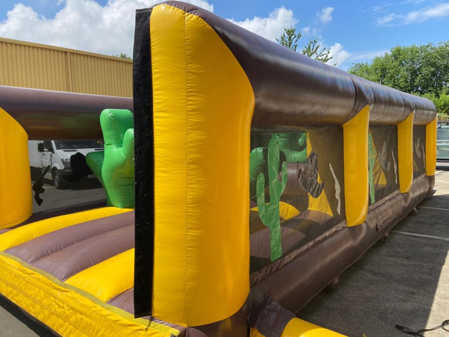 This 70ft inflatable beast includes 2 pieces: an exciting entrance and a thrilling 10ft platform slide. 🎉 It's a crowd-puller at public events and an excellent team-building activity for all ages. Whether you want to challenge your colleagues at a corporate fun day or add excitement to a school sports day, this Wild West themed obstacle course is sure to impress!