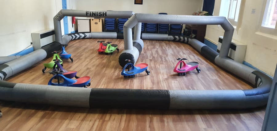 Our Didicar track is hired with 10 qty Wiggle cars ideal for under 8 years these cars are a great add on. Hire the track with the cars or just the cars. This track can be used on hardstanding which is level or indoors. We can provide sandbags for this inflatable.