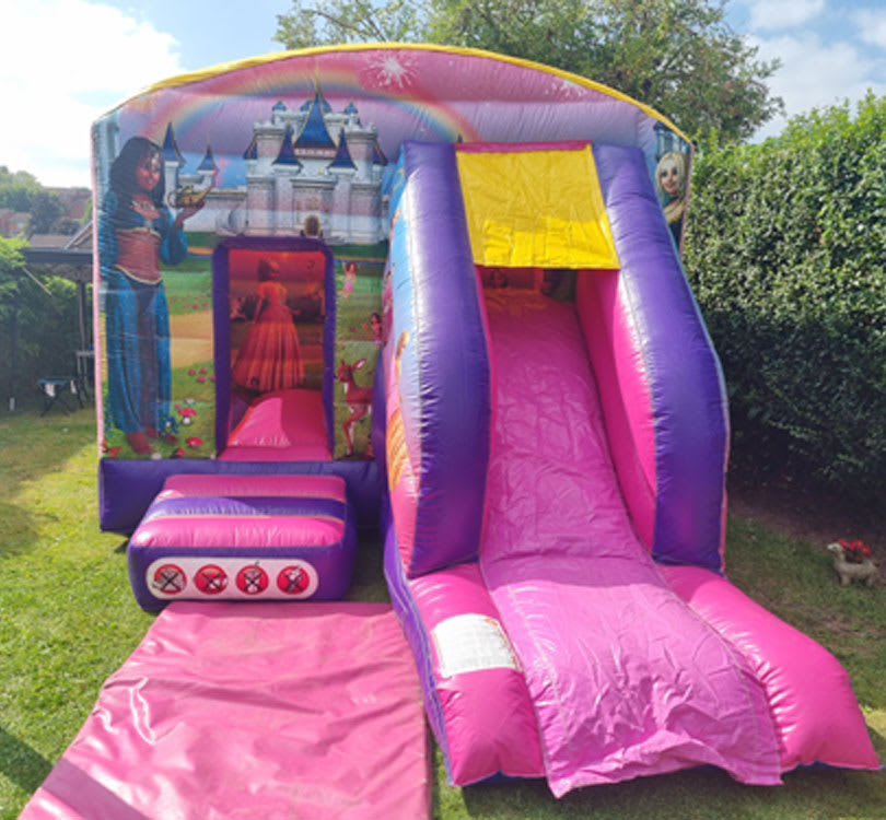 A Princess themed bouncy castle with a slide to the front, lovely girly pink castle Ideal for hiring to private gardens and indoor parties.