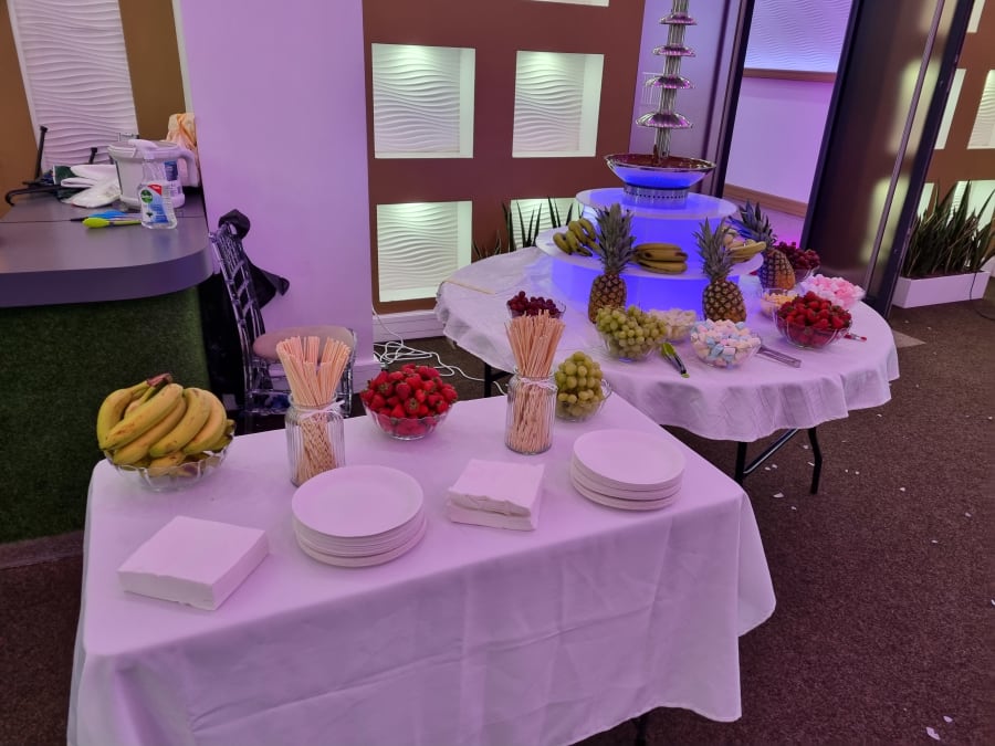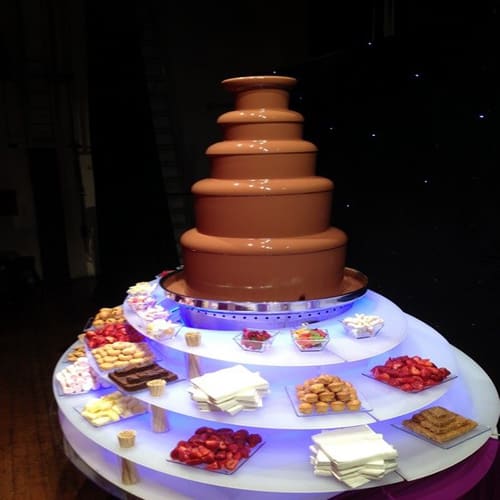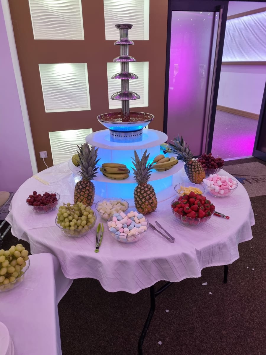 Chocolate Fountain service we provide the fountain on our table with, a light up base a selection of fruits, savory and sweets etc to dip in the chocolate.