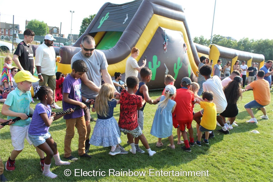 3 inflatables supervised with our staff, Sound System with Microphone and Music and a gazebo to cover the sound system